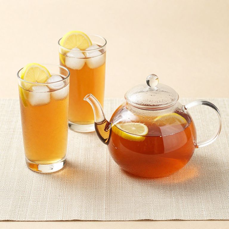 Sweet tea recipe showcased with a glass teapot filled with amber-colored brew, accompanied by two tall glasses garnished with lemon slices and ice cubes, all neatly arranged on a textured beige placemat.