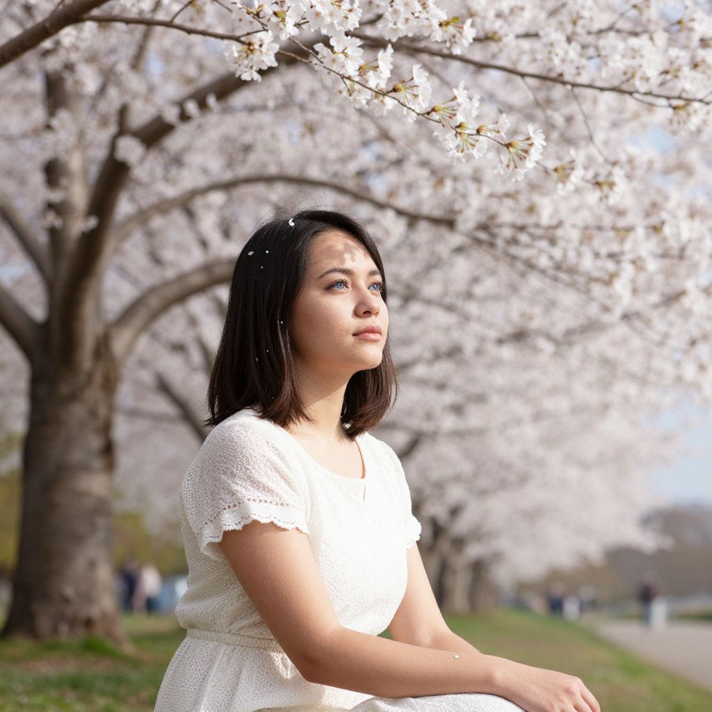 A young Micronesian woman with captivating blue eyes and delicate features sits contemplatively beneath a majestic cherry blossom tree in a sun-dappled garden. Her peaceful expression, illuminated by sunlight filtering through the blossoms, casts soft shadows across her face. The intricate lace of cherry petals forms an ethereal backdrop, symbolizing life's fleeting beauty. Her gaze, fixed on the distant horizon, exudes quiet strength and profound thought amidst this serene natural sanctuary.