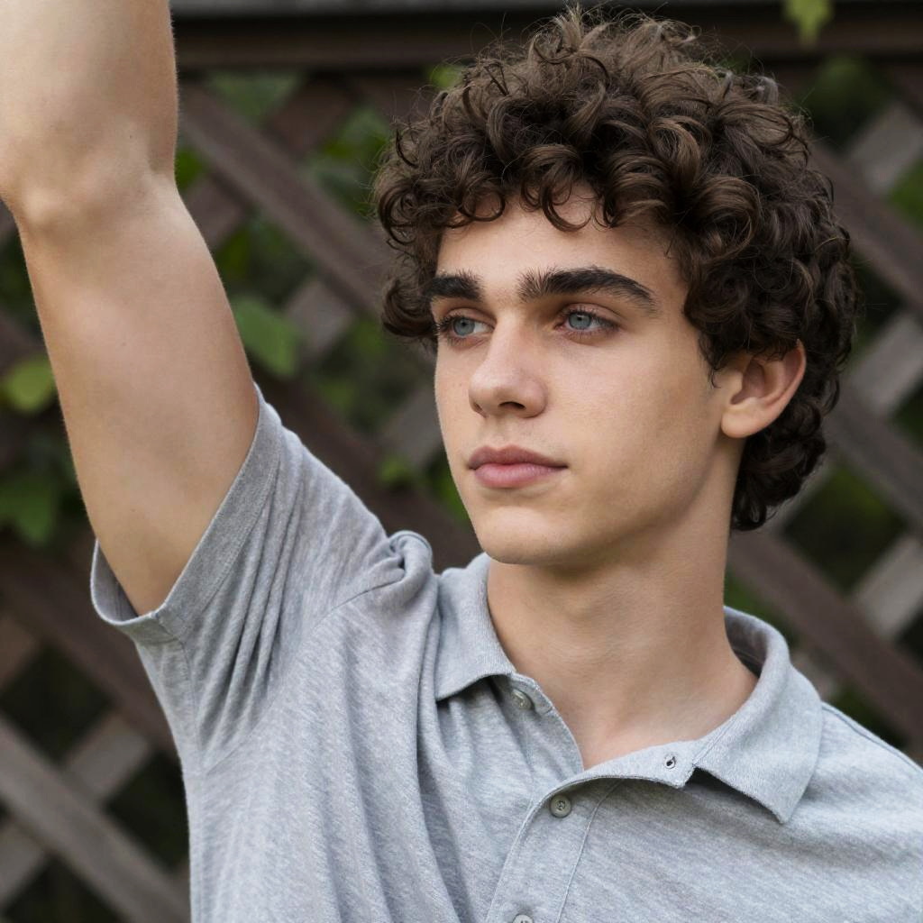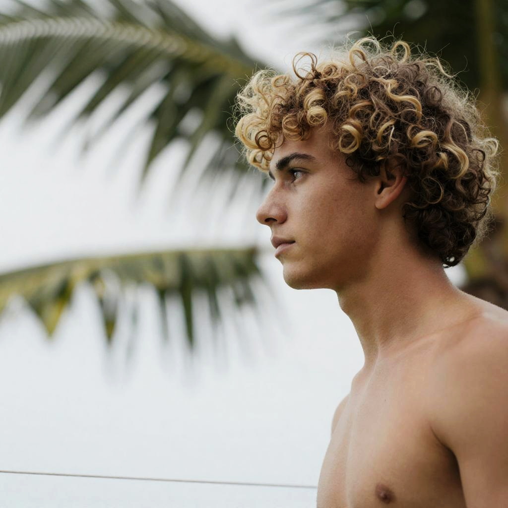 Portrait of a shirtless young man with curly brown hair and light skin smiling slightly. He is wearing a silver chain necklace. In the background, a man in a gray t-shirt with 'Cougars' printed on it stands slightly out of focus, with other blurred individuals wearing orange clothing further back.