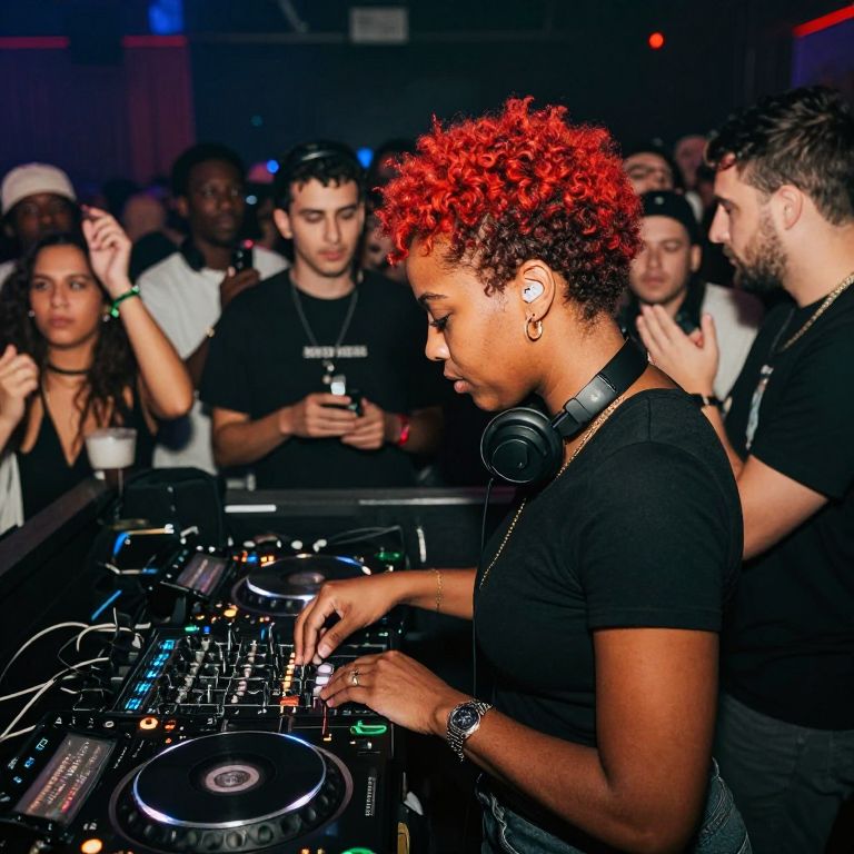 Photograph of a DJ with red curly hair, black shirt, and headphones, mixing music in a dimly lit club, surrounded by dancing, diverse