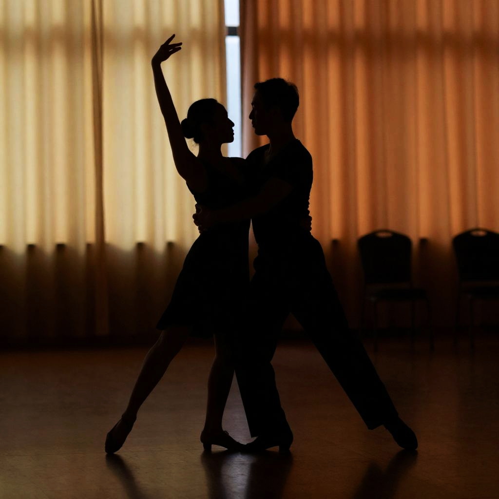 Silhouetted dance couple in a dimly lit room. Woman in knee-length dress with raised arm, man in pants with arm around her waist. Warm yellow light from left, orange curtains in background. Chairs on right. Dance floor with shadows.