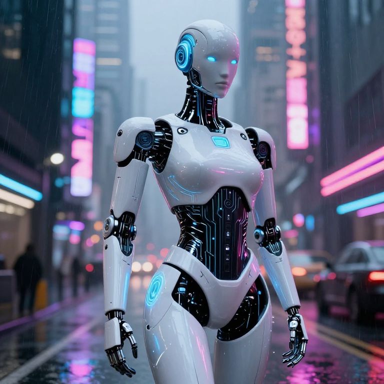 Digital art: A glowing, white-and-gold robotic woman with red eyes meditates on a pink lotus flower in a mystical, foggy garden