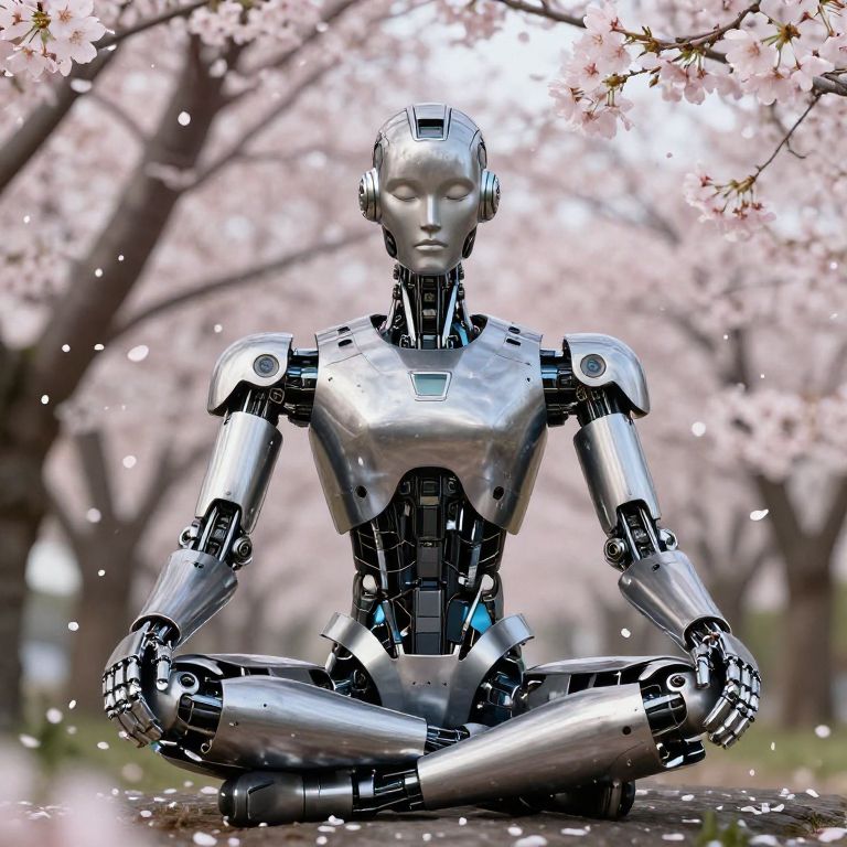 A digital CGI image of a sleek, white and gold robotic woman with glowing red eyes, seated in a meditative lotus position on a large, pink lotus flower in a serene, misty pond. Her black and gold armor-like chest and shoulder plates contrast with her white robotic limbs. Surrounding her are colorful flowers, small orange fish, and a traditional Japanese-style wooden pavilion in the background. Soft, ethereal lighting enhances the tranquil, mystical atmosphere. The robotic woman's design is futuristic, blending human and machine aesthetics in a calm, nature-filled setting.