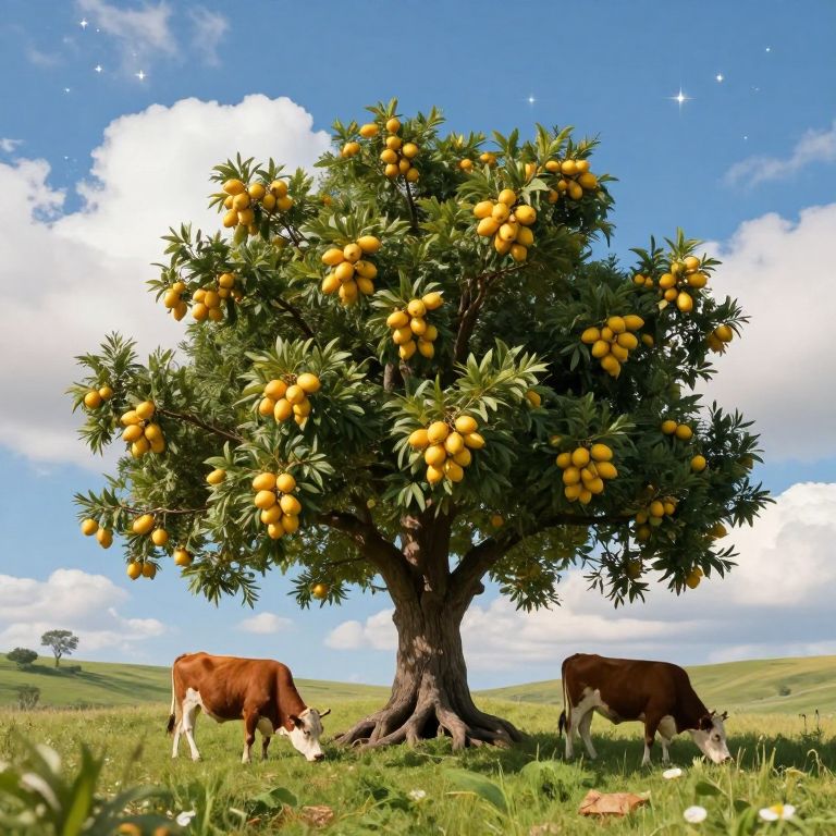Golden fruits dangle from a sprawling tree rooted firmly in a grassy hill, as two brown cows graze beneath its branches under a vibrant sky dotted with fluffy clouds and scattered stars.