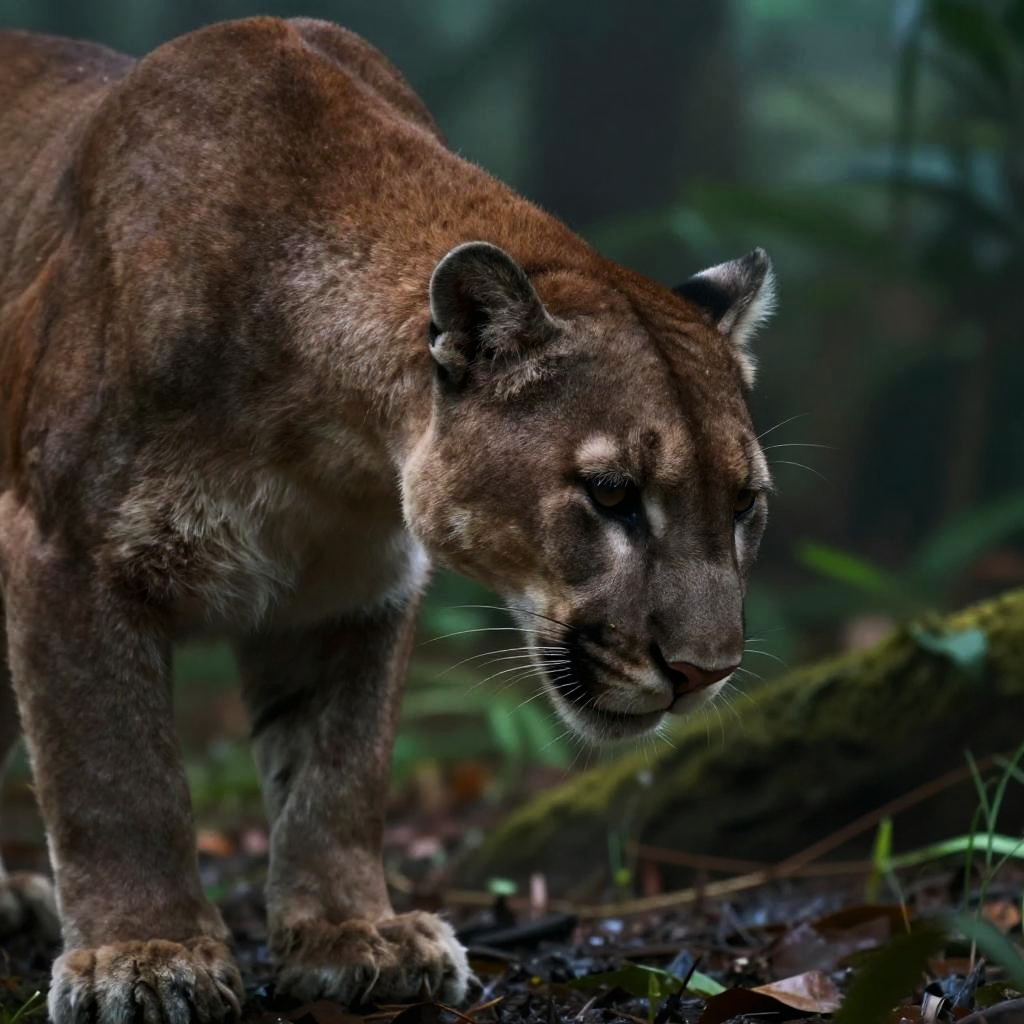 Award winning wildlife (medium long shot:1.4), 35mm film movie still, ultra photorealistic, photorealism, (upper profile) shot of a defeated old cougar in pain with the (sunken head:1.4) mourning (looking depressed down:1.2), (glossy eyes) cinestill, film grain, taken with hasselblad H6D 100c, the HCD 24mm lens, hazy mood, cinematic dramatic lighting, cold muted colors, (DOF:1.4), (dark lush jungle background), sharp focus, (perfect real extremely details), amazing fine detail, absurdres, hyper realistic lifelike texture