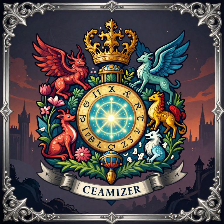 Digital illustration of a vibrant, ornate coat of arms with a central golden clock featuring Roman numerals and a glowing blue light. Surrounding the clock are colorful mythical creatures: a red dragon, blue griffin, yellow lion, white unicorn, and a red and blue phoenix. Each creature is adorned with intricate details and wings. The background is a dark, twilight sky with silhouetted castle towers. Above the clock is a golden crown with a detailed design. Below, a white ribbon with "CAMIZER" in bold black letters. The frame is decorated with silver, ornate patterns. The style is vibrant and cartoonish.
