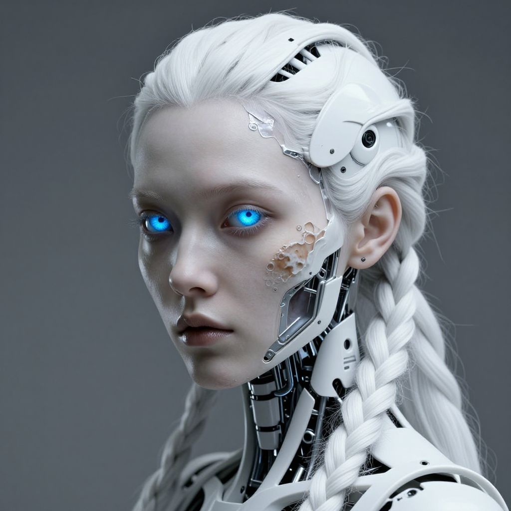 This digital artwork depicts a futuristic, cyborg woman with long, silver-white hair and pale skin. Her face is a blend of human and robotic features, with a metallic, robotic neck and visible mechanical components. She has blue eyes and dark gray lips. The background is a dark, almost black gradient, highlighting her illuminated face and metallic parts. Her robotic neck shows intricate, shiny metal and wires, blending seamlessly with her human-like head. The image has a high-contrast, hyper-realistic style, emphasizing the blend of organic and artificial elements.