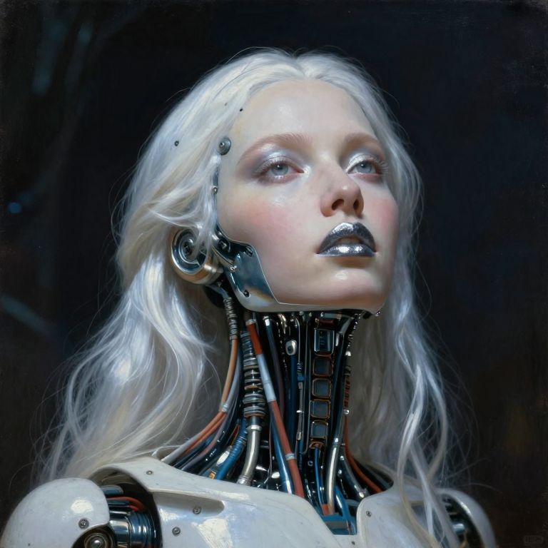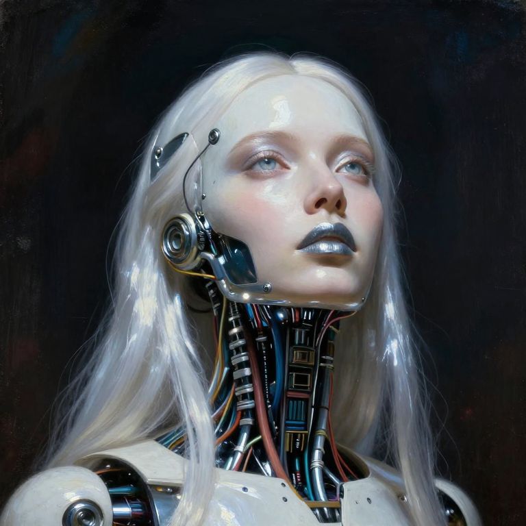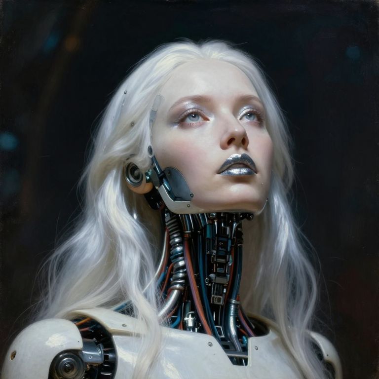 Impressionist classical-style painting of a highly detailed, fantasy scene with a dramatic, robotic aesthetic, The central figure is a female robot, Her head and body are made of white, shiny and smooth metal with multi-colored, exposed wiring going down her neck creating an organic mosaic pattern, She is a biomechanical robot and there are wires jacked into her face, Her eyes are an intense silver color with light silver eyeshadow, and her lips are a rich, deep silver color, There is a missing panel on her cheek, A spot light focuses on her from above, Her hair is stark, metallic white strands that falls around the lower half of the image, She is blending in with the background, She is facing you and looking up into the sky intensely, The overall impression is one of dramatic beauty, with an almost otherworldly quality, ultra-realistic style), realistic soft lighting, dark, eye-catching, atmospheric lighting, natural, shallow depth of field, (highlights, high detail dynamic, cinematic shot, film grain, bokeh, depth of field