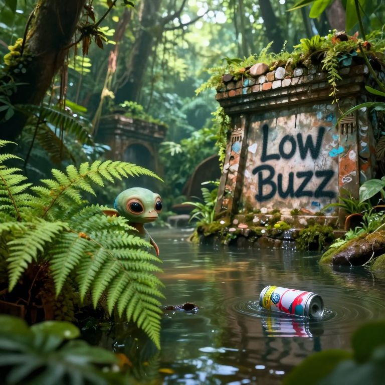 Digital illustration of a lush, overgrown jungle scene with dense greenery and ferns. In the foreground, a small, green, cartoonish creature with large, expressive eyes peeks from behind ferns, gazing at a rusted, brick sign in the mid-ground that reads "LOW BUZZ" in bold, black letters. The sign is covered in moss and graffiti. A colorful, partially submerged soda can floats in the shallow, reflective water at the sign's base. Sunlight filters through the dense canopy above, casting dappled light across the scene. The background includes more foliage and an arched, stone structure partially obscured by trees.