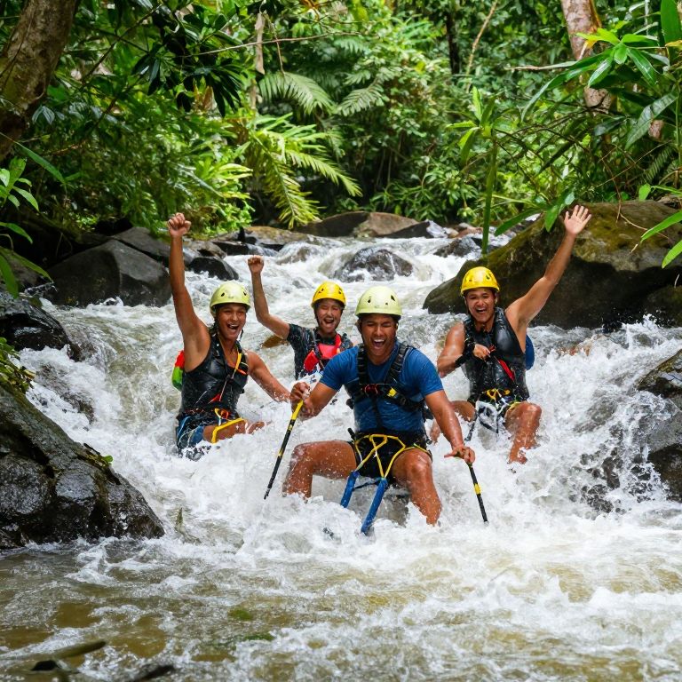 Adrenaline pulses through the heart of the jungle as four adventurers navigate the roaring rapids, their laughter echoing amidst the symphony of rushing water and rustling leaves, embodying the thrill of freedom and the unity of shared adventure.