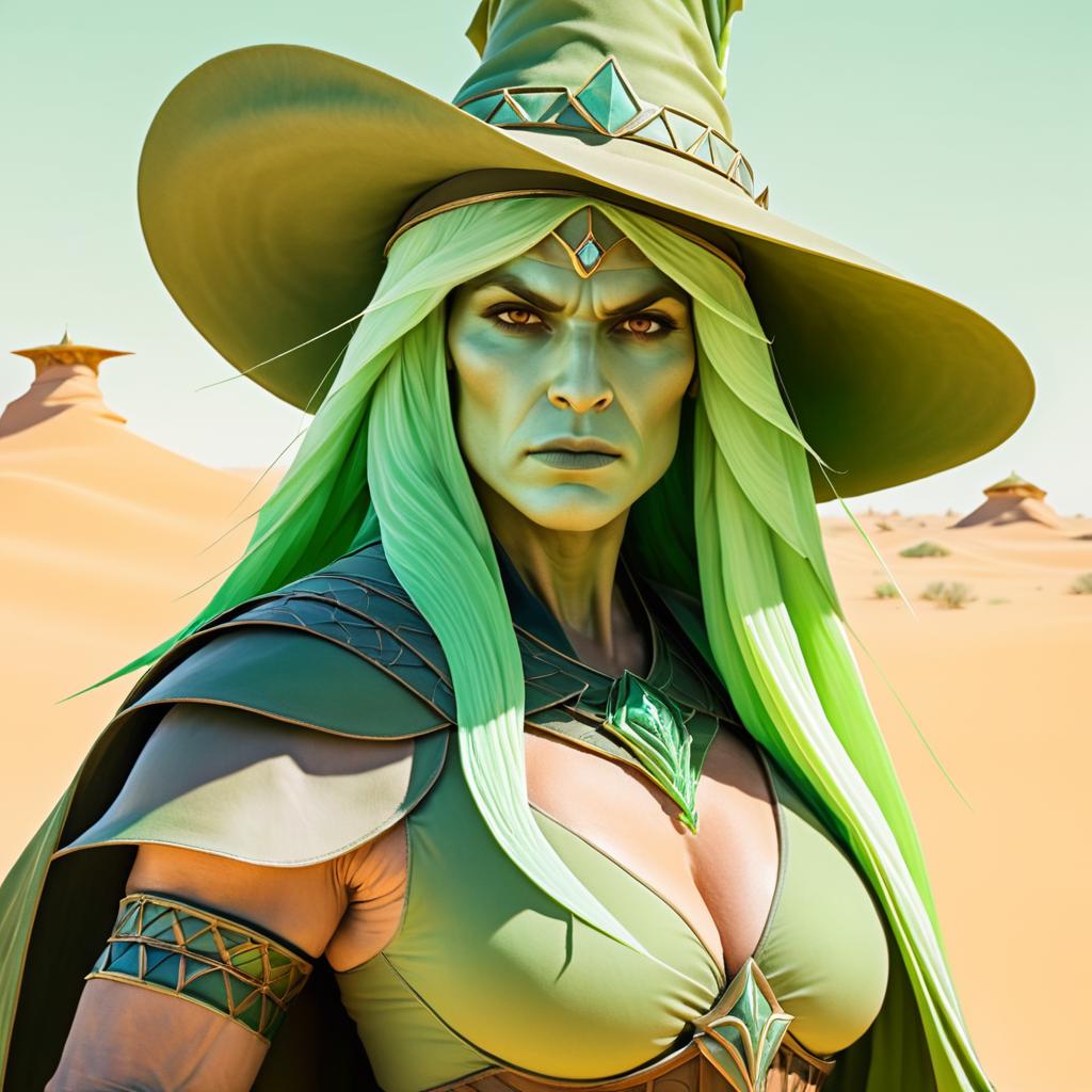 Portrait of a muscular middle-aged witch with pale green skin, a long crooked nose, and a wide-brimmed hat. Set in a desert wearing armor, inspired by Tyler Jacobson, Greg Rutkowski, Alphonse Mucha.