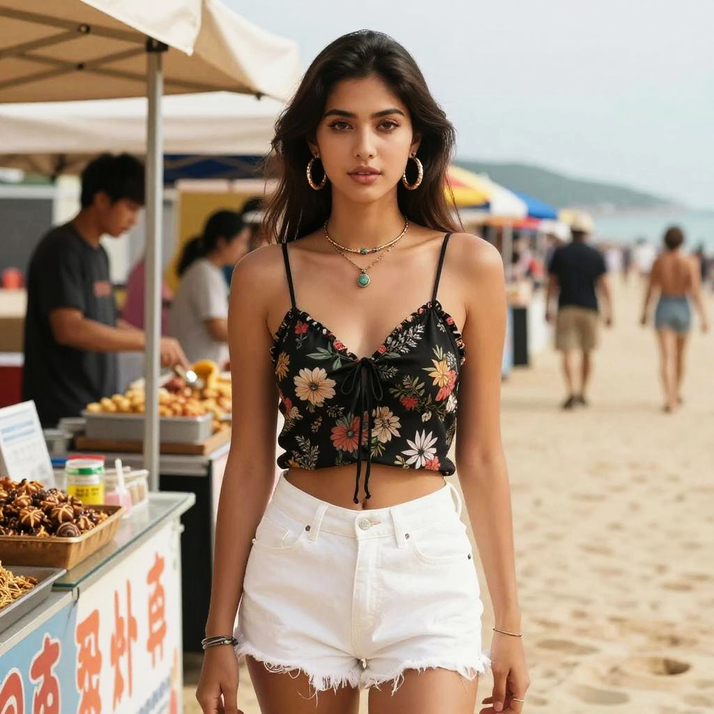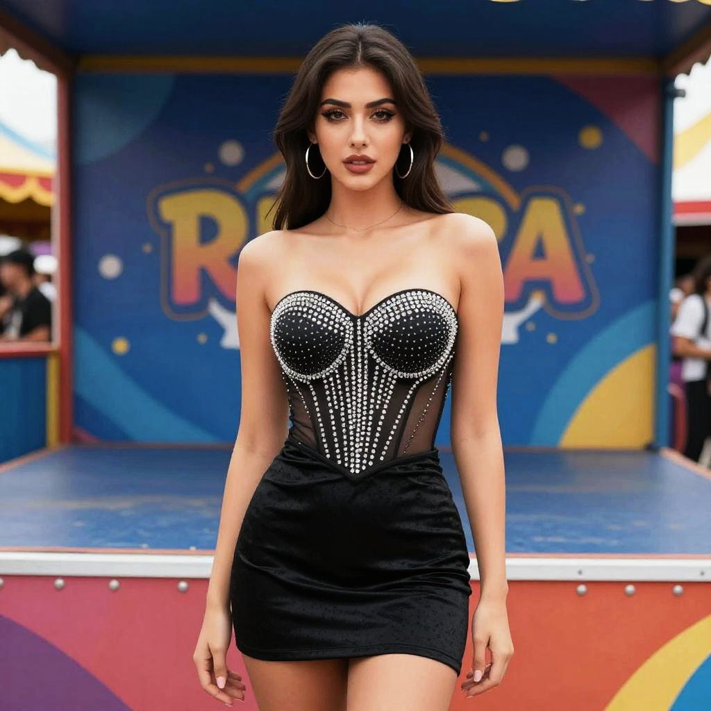 A hourglass woman in a bold animal print strapless crop top and high-waist shorts stands confidently on a vibrant carnival street, surrounded by colorful performers and festive decorations, embodying the lively visual style of Antarctic Press. Large hoop earrings accent her natural makeup and wavy hairstyle. Sexy. Pretty face and beutiful eyes