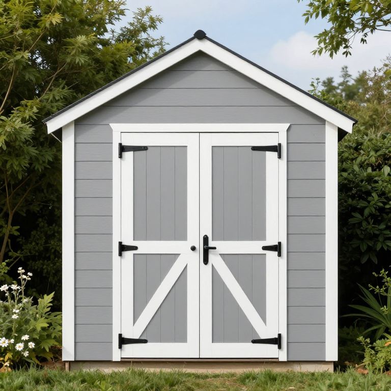 Charming utility shed featuring a classic A-frame design with gray siding, white trim, and double doors adorned with black hinges and a central handle, set against a backdrop of lush greenery and a clear sky.
