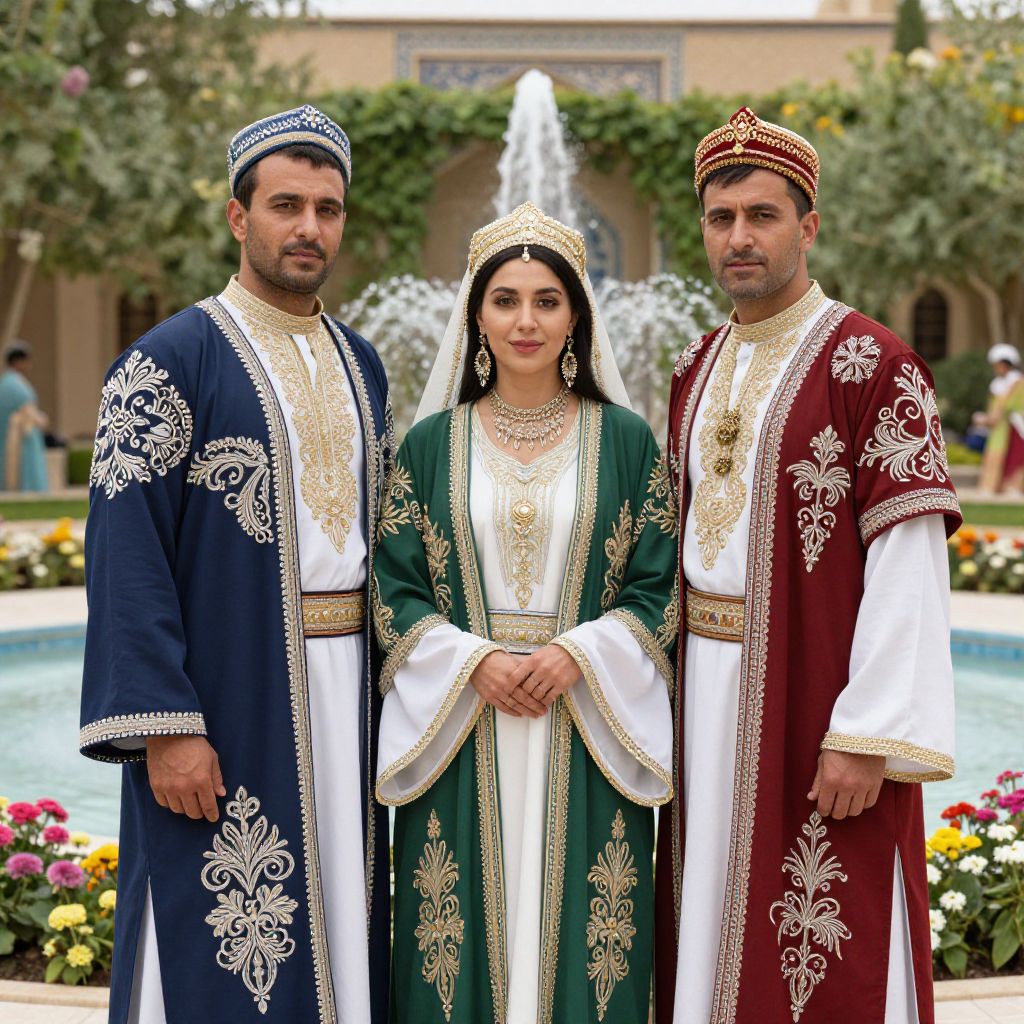 Persians traditional clothing portrait, men and women in colorful Persian robes with detailed embroidery, intricate jewelry and headpieces, standing in lush Persian garden with fountains and blooming flowers, soft natural lighting, highly detailed realism