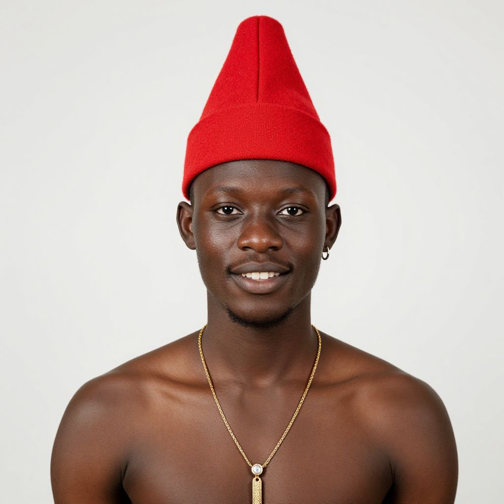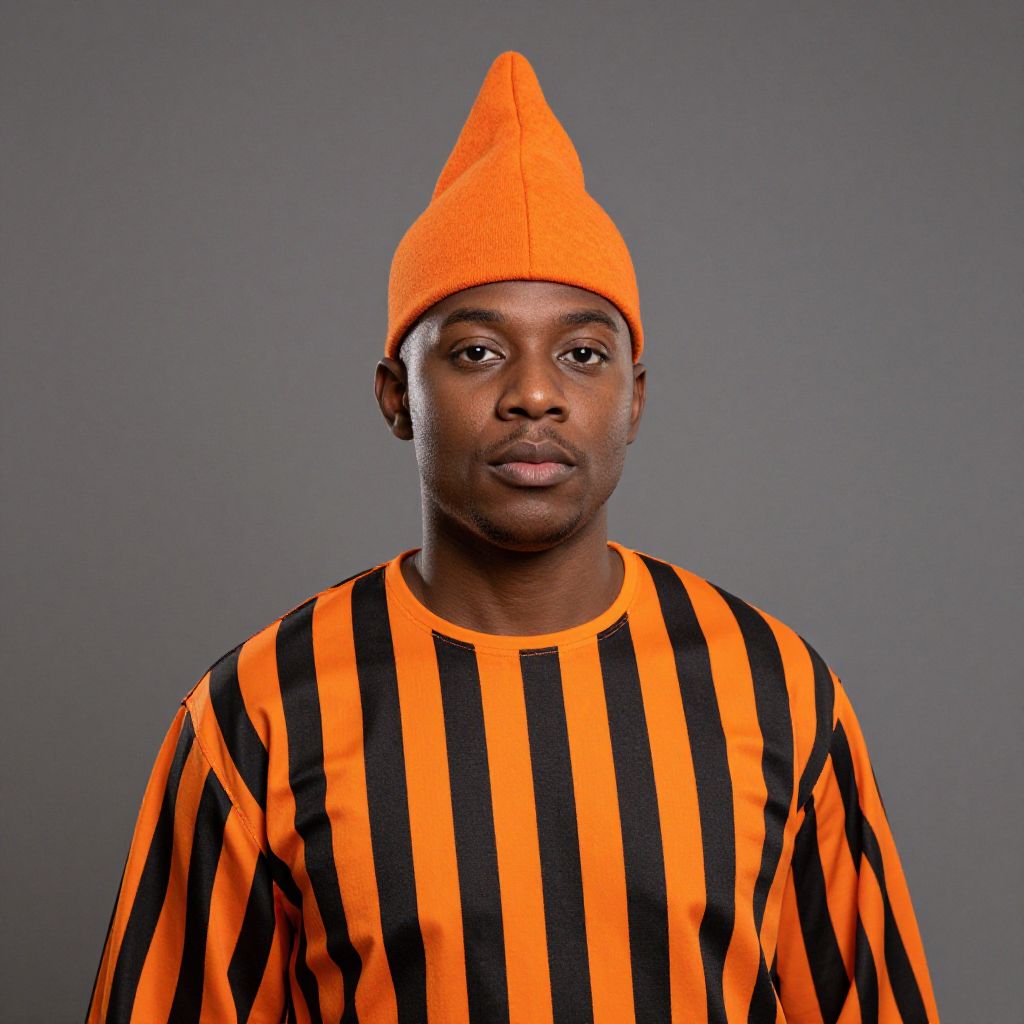 Photograph of a Black man with a medium-dark skin tone, wearing a bright orange, cone-shaped hat and a long-sleeved shirt with vertical orange and black stripes. His expression is neutral, and he looks directly at the camera. The background is a plain, gradient gray, making the vibrant colors of his hat and shirt stand out. The image has a studio lighting setup, highlighting his face and upper body. The texture of the hat appears knitted, while the shirt has a smooth, slightly shiny fabric.
