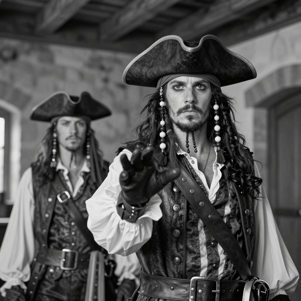 Black and white photograph of three men in 18th-century pirate attire. Two men with large, feathered tricorn hats and one man with a simpler hat. The central man has a beard, the others clean-shaven. Birdcages and parrots on a wooden table. The man on the right smokes a pipe. The man on the left leans forward, while the central man looks to the side. Background includes wall ures and hanging objects.