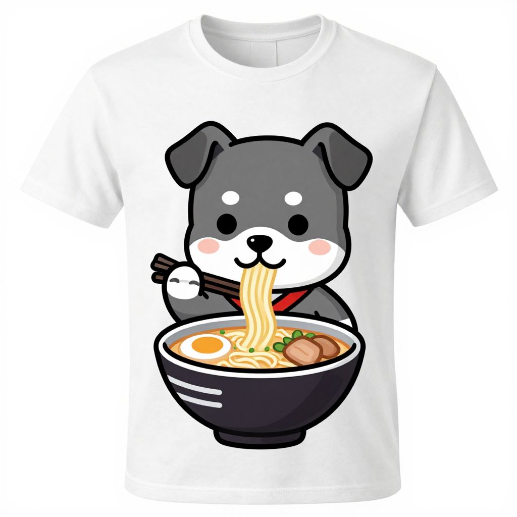 Chibi-style digital drawing of a cute black-and-white dog eating ramen from a black bowl on a white T-shirt.