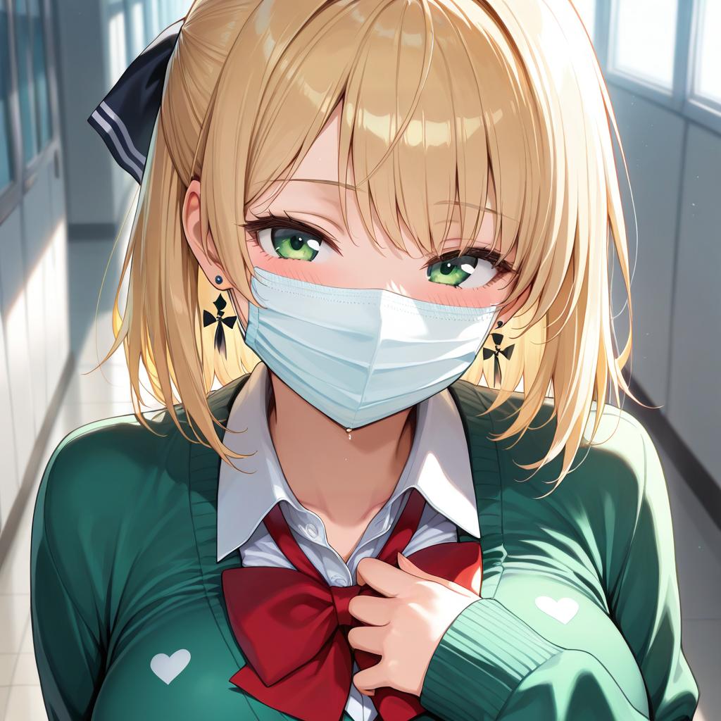 (best quality:1.1), (masterpiece:1.4), (absurdres:1.0), portrait, close up, 1girl, wakakusa moena, surgical mask, heart pattern, green eyes, hair ribbon, cross earrings, blonde hair, large breasts, school uniform, plead skirt, (green cardigan:1.2), looking at viewer, classrom, smile, hand on chest