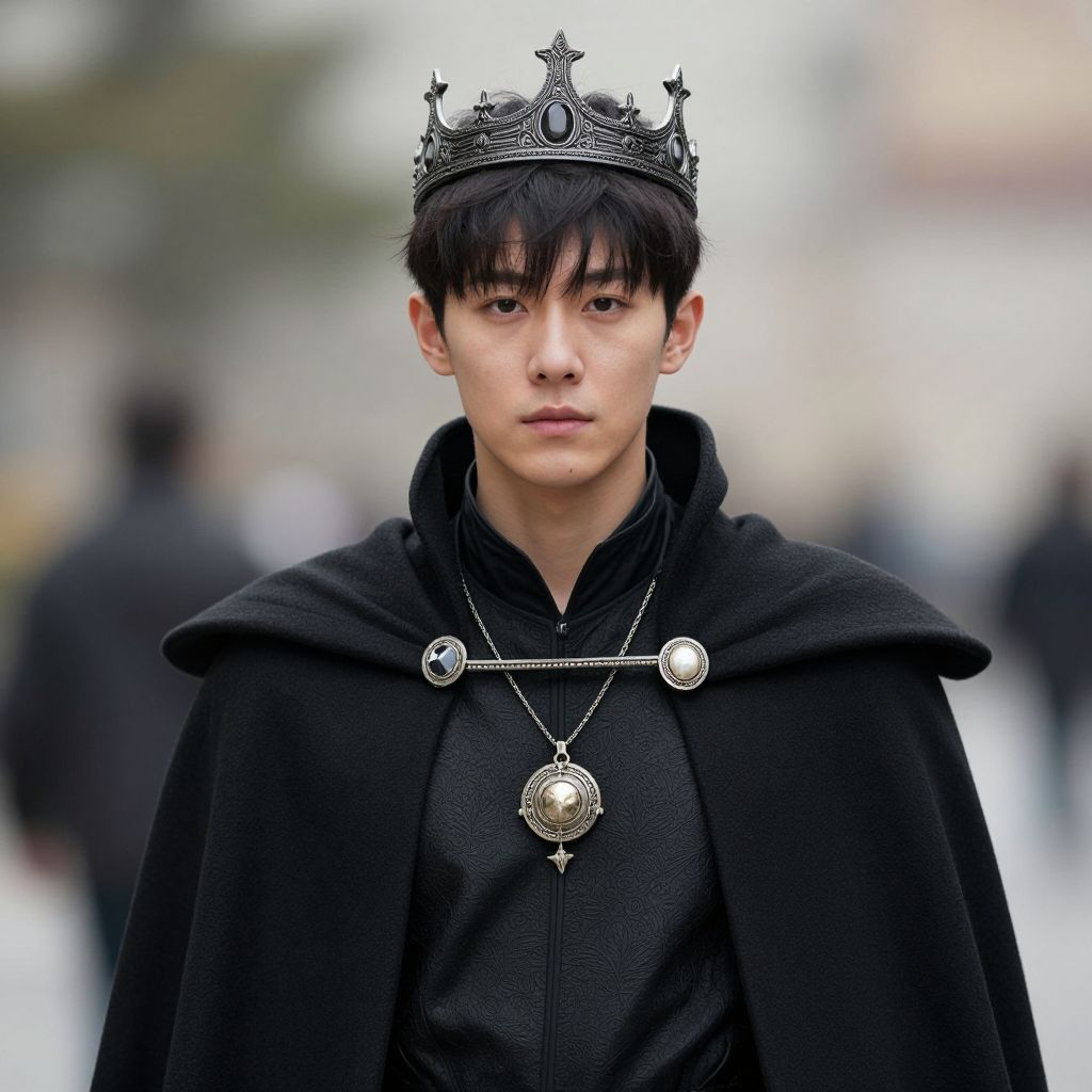 Photograph of a young Asian man with fair skin, short black hair, and a serious expression. He wears a black, ornate crown with intricate detailing and a black cloak over a high-collared shirt. Around his neck are three silver pendants, including a large, circular one with a detailed center. The background is blurred, featuring indistinct shapes and people in dark clothing, suggesting an outdoor urban setting. The image has a sharp focus on the man, highlighting his regal attire and solemn demeanor.