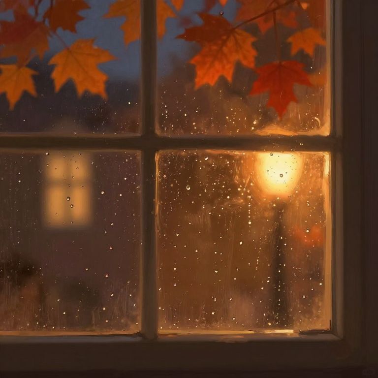 Pitter of small droplets on the windowpane during a cozy autumn evening, warm indoor lighting reflecting off the glass, blurred orange and red leaves outside, intimate and nostalgic feeling, digital painting style with soft textures.