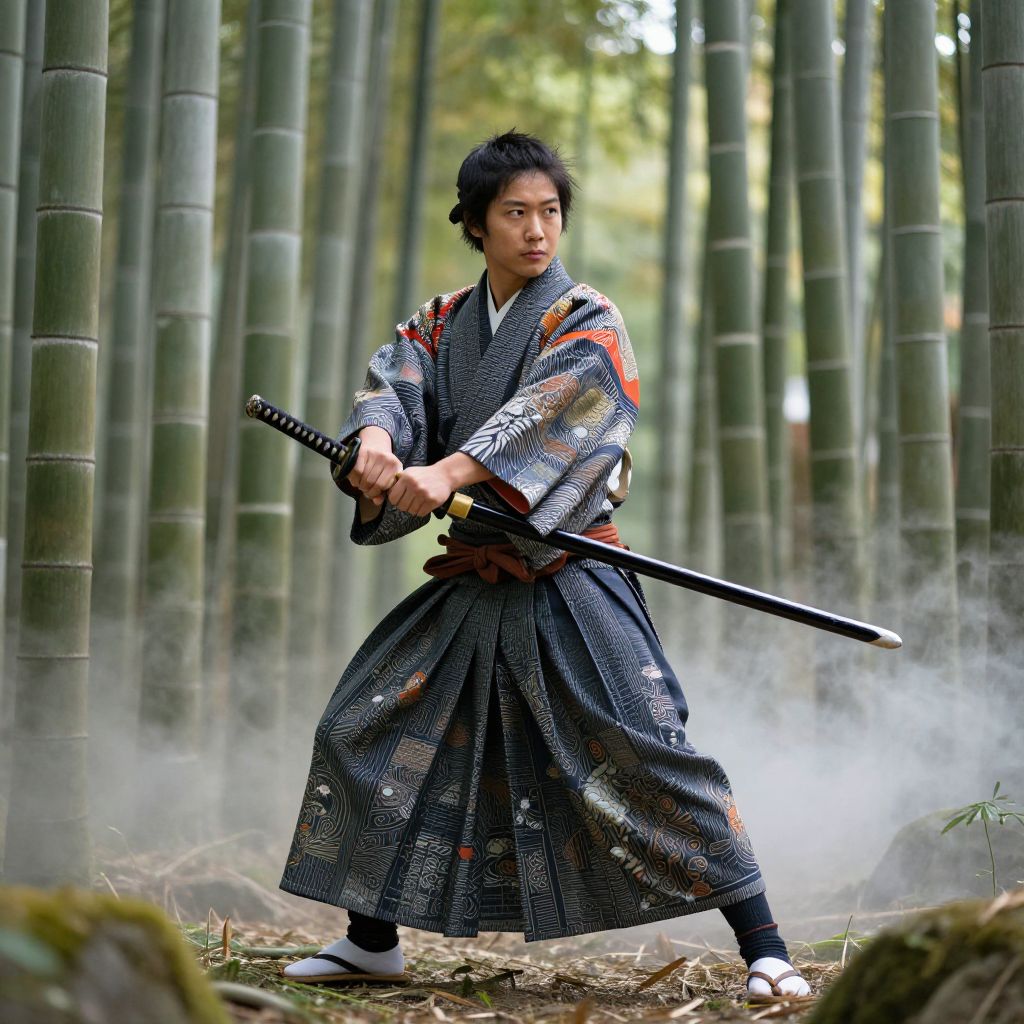 Samurai wearing an intricate yukata, holding a katana with precision, surrounded by tall bamboo forest, mist curling around the feet, dynamic yet calm posture, vibrant yet natural colors, capturing the spirit of feudal Japan's warrior culture with elegance.