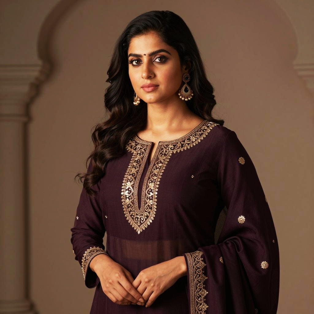 A woman is elegantly dressed in a traditional dhoti suit salwar featuring intricate embroidery on the cuffs and neckline. The portrait captures her poised expression and classic styling, highlighting the rich cultural attire in a photorealistic manner.