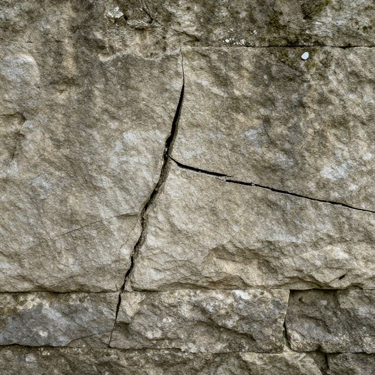 Cracks spreading across an ancient stone wall, detailed texture showing moss and weathering, soft natural light highlighting the deep fissures, high resolution, realistic rustic background