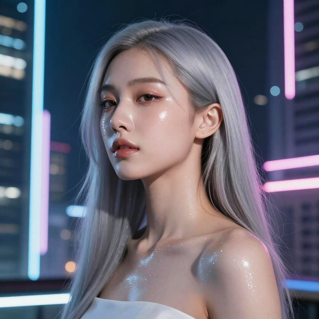 Photorealistic digital artwork of an Asian woman with long, silver hair and fair skin, illuminated by neon city lights. Her face and shoulders are glistening with a shiny, reflective texture. She has a calm, slightly serious expression, with pinkish-brown eyes and subtle makeup. She is wearing a strapless white top, revealing her bare shoulders. The background features blurred, brightly lit skyscrapers with vertical neon blue and pink lights, creating a futuristic, nighttime urban scene. The image has a high contrast and glossy finish, emphasizing the sleek, modern aesthetic.