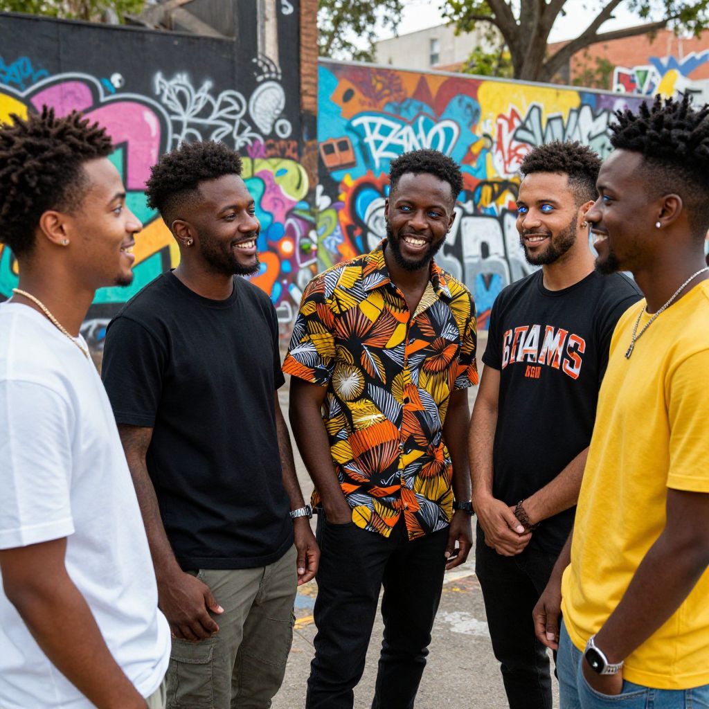 Group of black men with blue eyes and curly hair sharing laughter in an artistic urban park, vibrant graffiti walls behind them, wearing casual streetwear with bold patterns, showcasing diversity and camaraderie with a warm, candid atmosphere and strong contrast lighting.