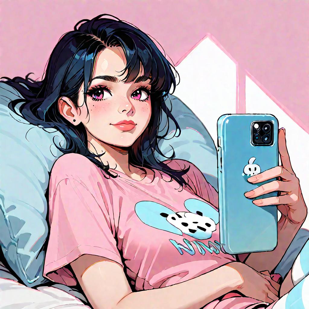 Score_9, score_8, score_7, source_anime, pink shirt, slut shirt, t-shirt, striped thighhighs, taut shirt, no pants, 1girl, solo, bedroom, looking at phone, light smile