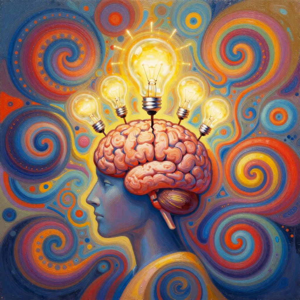 Ideenfindung concept as abstract art, swirling colorful shapes symbolizing thoughts and creativity, glowing light bulbs emerging from a central human brain, intricate patterns representing neural connections, bright and energetic colors, digital painting style