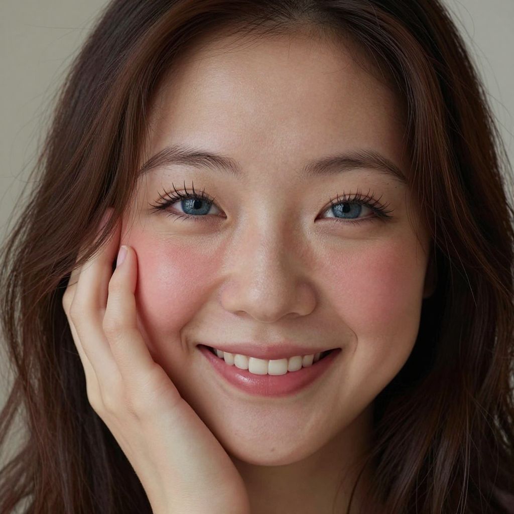 Photograph of a young Asian woman with fair skin, blue eyes, and long, wavy dark brown hair. She smiles gently, showing straight white teeth. Her right hand gently touches her cheek, highlighting her soft pink blush. She has long, dark eyelashes and light pink lips. The background is a plain, light gray, which makes her face the focal point. The image has a natural, soft lighting that enhances her youthful and fresh appearance. Her expression is warm and friendly.