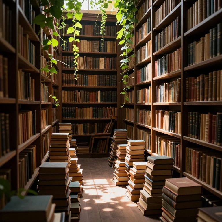 Photograph of a narrow, sunlit library aisle with tall, dark wooden bookshelves filled with numerous books. Stacks of books are piled on the floor, creating a path. Sunlight streams in from above, casting shadows and illuminating green leafy vines hanging from the ceiling. The shelves are densely packed, and the books display various colors and sizes. The wooden floor is slightly worn, adding to the vintage, scholarly atmosphere. The light and shadow create a warm, inviting, and slightly mysterious ambiance.