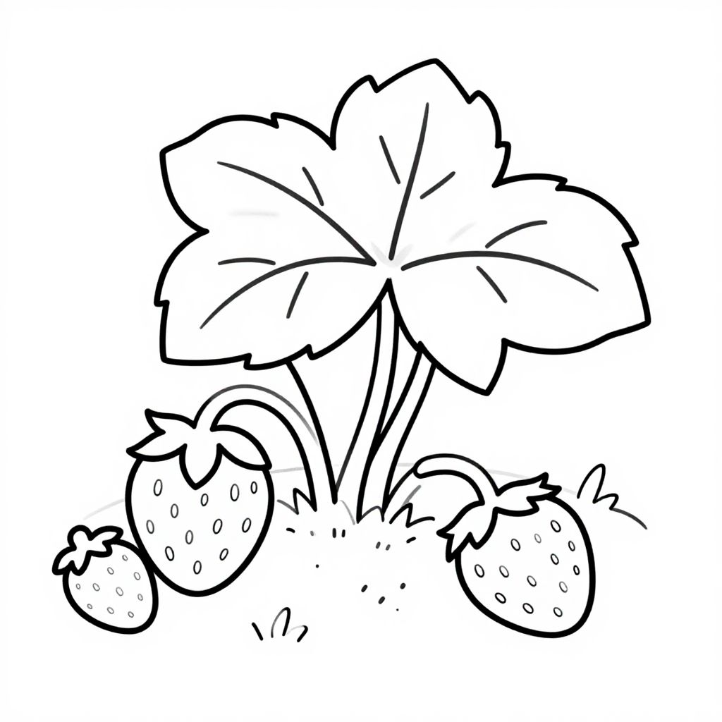 Black and white line drawing of a strawberry plant with large leaves and three strawberries with dots, simple and cartoon-like style.