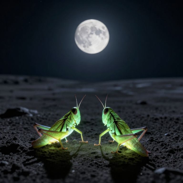 Two luminous grasshoppers, bathed in the ethereal glow of a full moon, stand poised on a desolate lunar landscape, their forms illuminated by an otherworldly light that defies the starkness of the surrounding terrain.