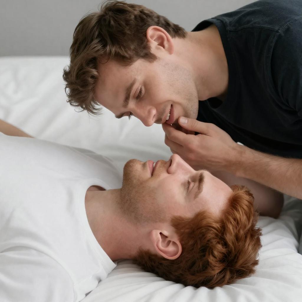Photograph of three shirtless men with varying hair colors and skin tones, standing closely together. The man on the left has dark hair and a medium build, gently touching noses with the man in the center, who has short blonde hair and a lean build. The man on the right, with light brown hair and a muscular build, smiles at them. Warm, yellow-toned background.