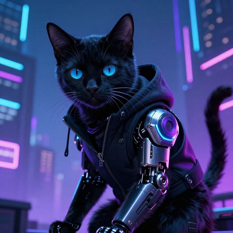 Anthropomorphic black cat as a futuristic cyberpunk hacker, neon-lit cityscape background, cybernetic enhancements glowing blue and purple, detailed fur with reflective metallic elements, dynamic pose, detailed digital art, high contrast and vibrant palette.