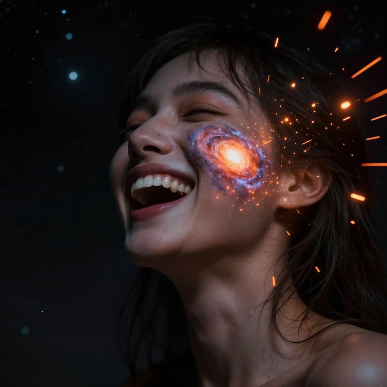 In a cyberpunk-inspired digital art rendering, a celestial being's joyful laughter ignites a miniature galaxy on their cheek, casting radiant orange sparks that distort the surrounding spacetime against a dark, starry backdrop.