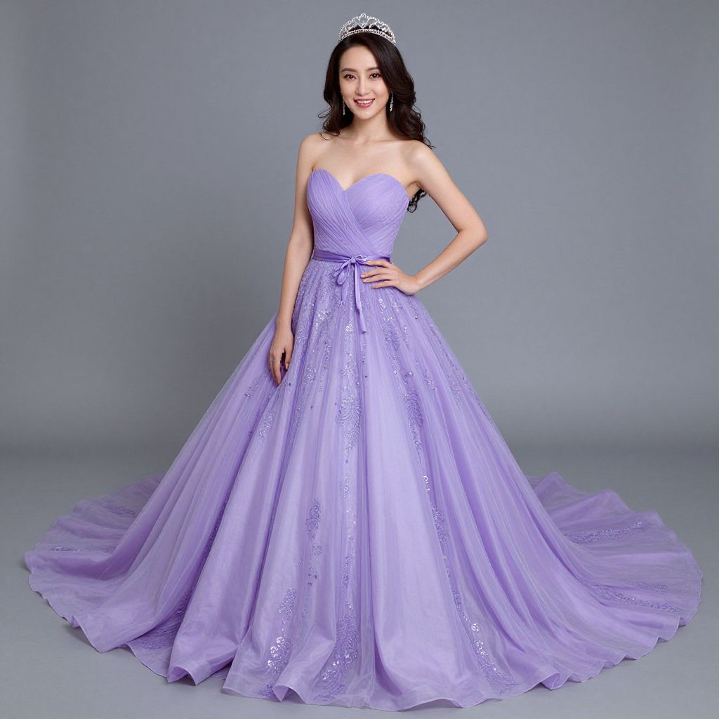 "Violet Gown Birthday, a woman in a purple dress and a tiable is posing for a picture"