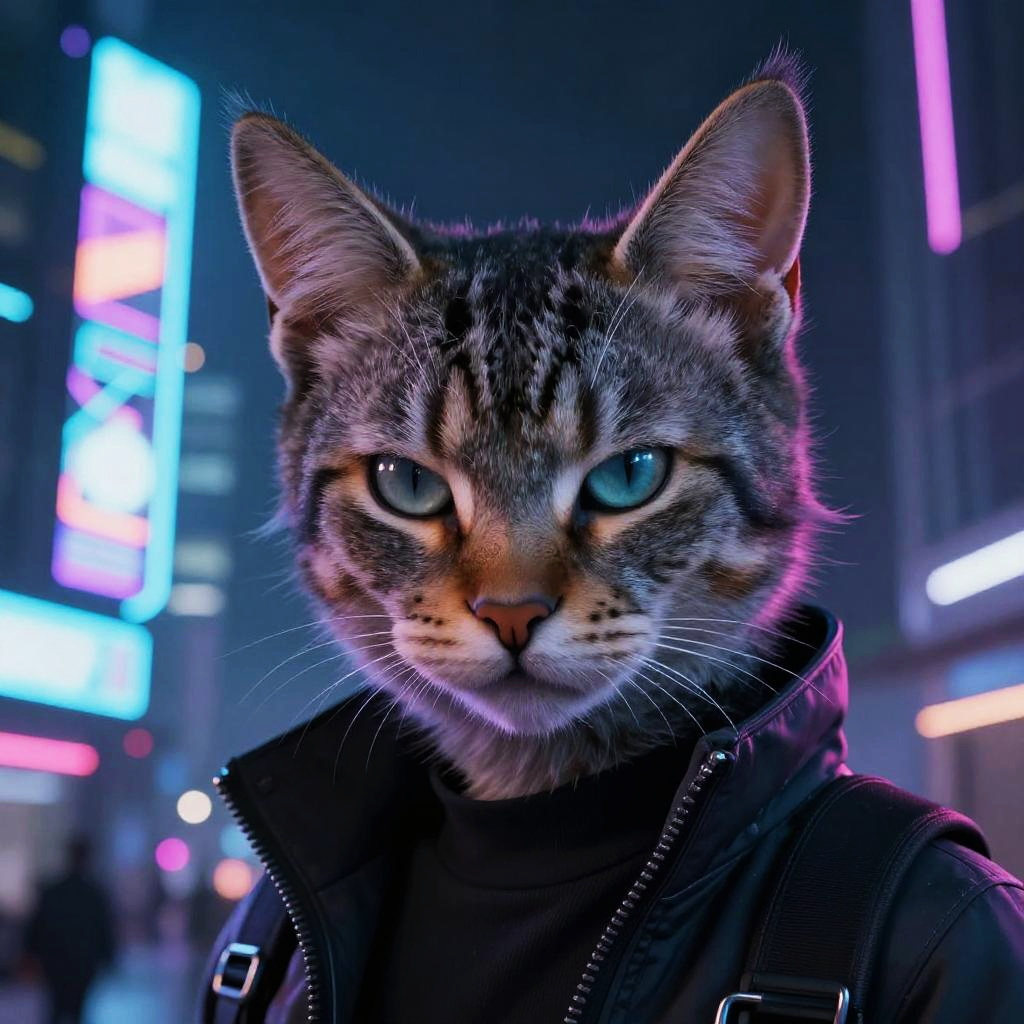 White fluffy cat with shiny dental braces, neon-drenched cyberpunk alley with rain mist and reflective puddles, photorealistic 3D render with glossy reflections and volumetric fog, sleek and futuristic vibe, vibrant magentas and teals, soft rim lighting, global illumination, high detail, crisp texture, subtle bloom, atmospheric depth, balanced composition, rule of thirds, gentle vignette, sparkling highlights on metal, refined color grading, high resolution, playful yet polished finish