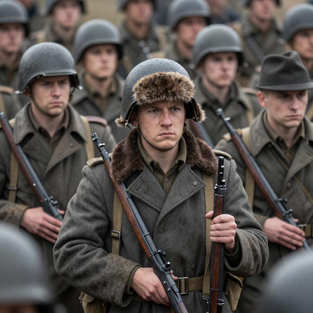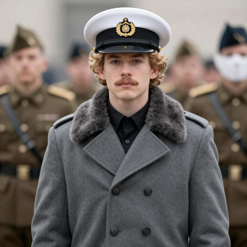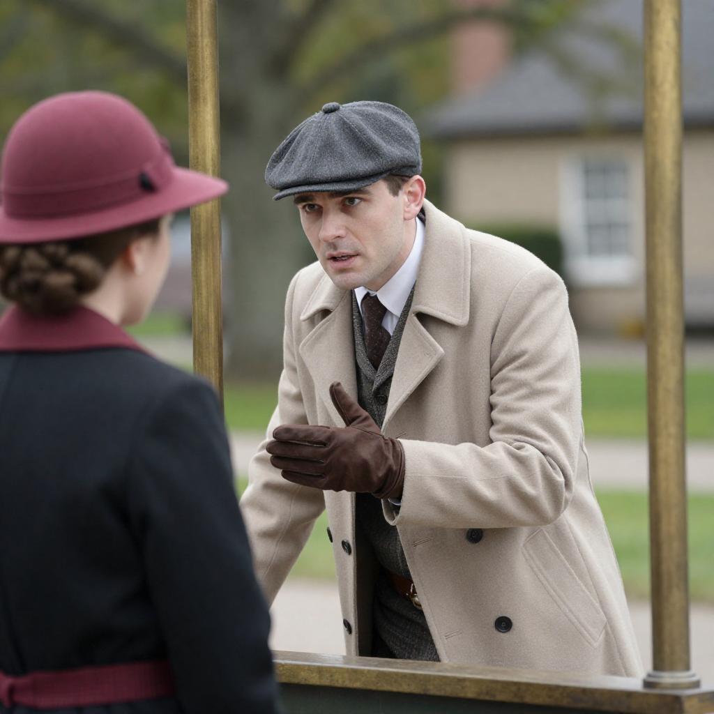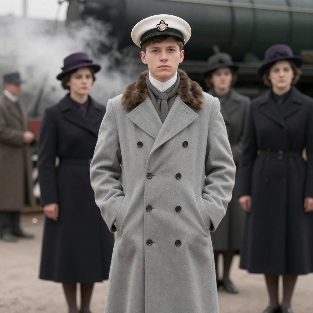 Photograph of a group of people in early 20th-century attire. Central figure is a young man in a light gray double-breasted coat with a fur-collared scarf, white naval hat, hands in pockets, standing straight. Background includes three women in dark coats and hats, one with a purple hat, standing near a vintage train with smoke. Other people in the background. Steam visible. Facial expressions are neutral.