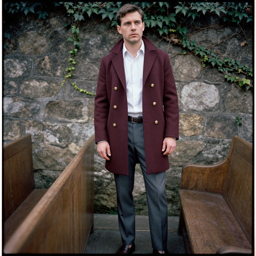 A man, burgundy wool overcoat with gold buttons, slim-fit gray dress pants, white oxford shirt, dark brown loafers, textured leather belt, rustic stone walls, ivy-covered facade, wooden pews, Ilford film stock, contemplative expression. Man has masculine face and piercing eyes