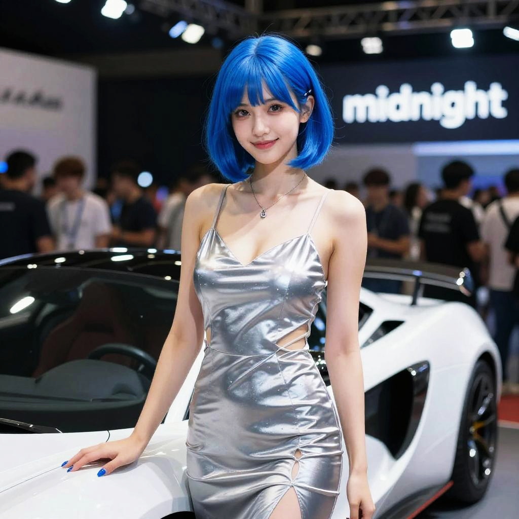 Photograph of an Asian woman with vibrant blue bob hair, wearing a shiny silver dress, standing beside a white sports car at a busy automotive exhibition.