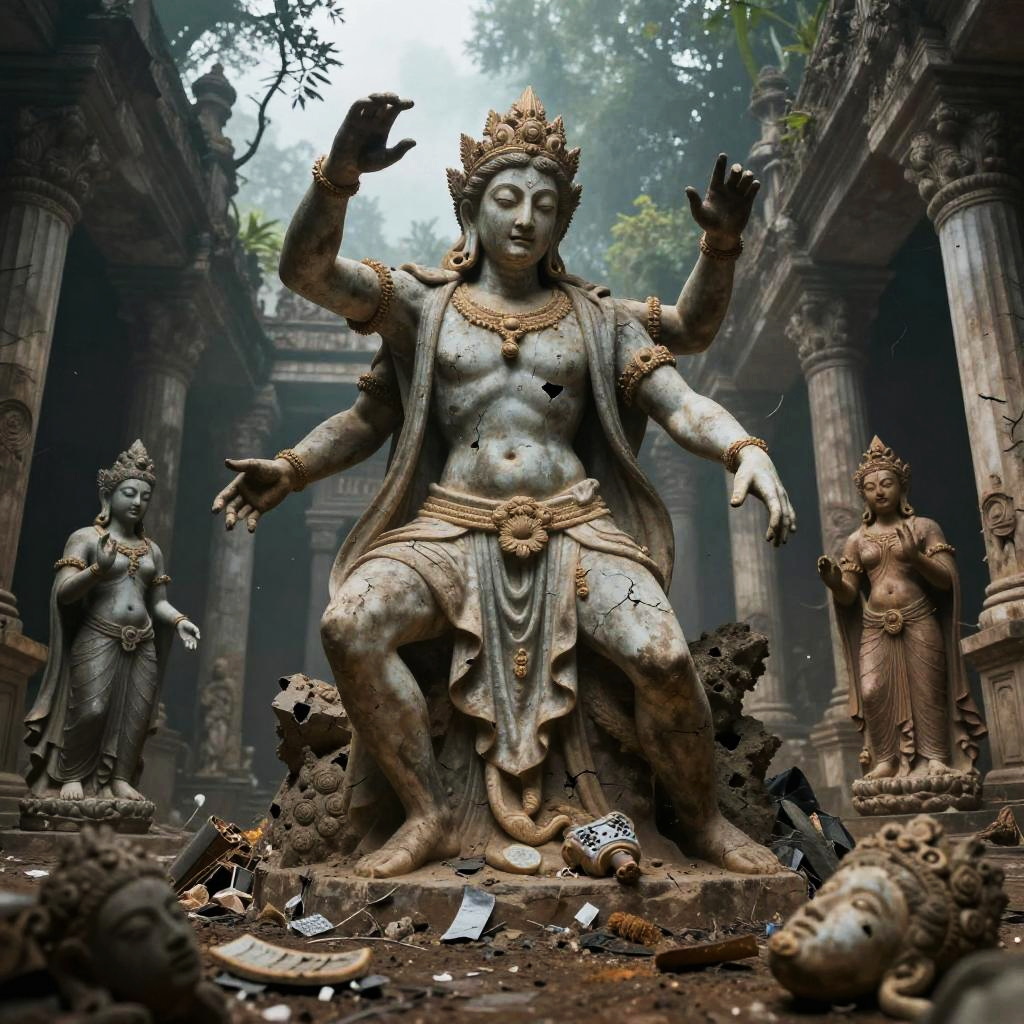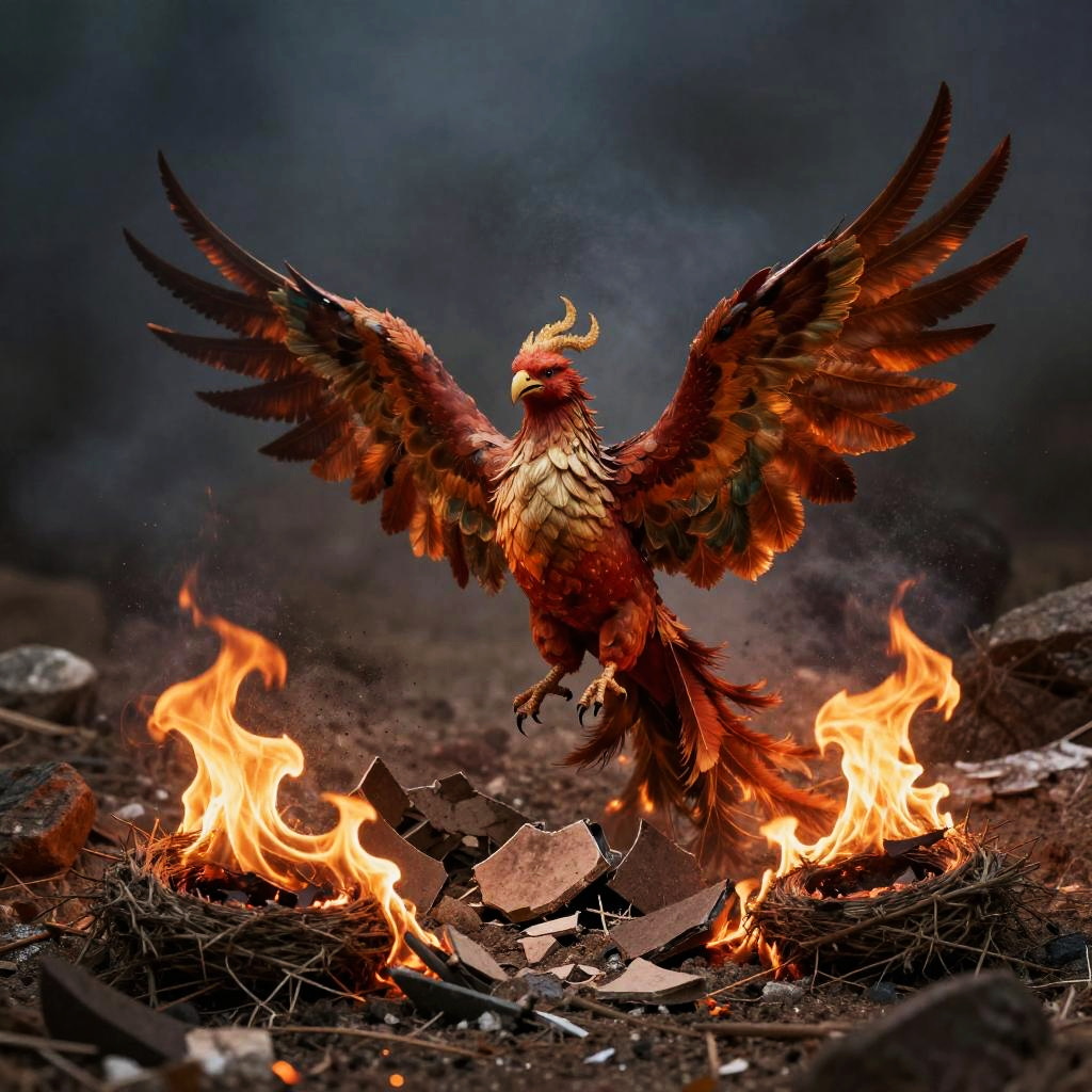 Fallen phoenix surrounded by a world in transformation, reflecting the feeling that everything is changing around us in ways that are hard to comprehend. The fallen phoenix appears caught in a battle against themselves, unable to escape their inner conflict. The composition includes visual representations of burning ashes, shattered flames, crumbling nests to symbolize the impact of our own actions on our world. The scene conveys a sense of melancholy and introspection, capturing the idea that each time we fail to understand ourselves and others, we contribute to the slow destruction of our world.