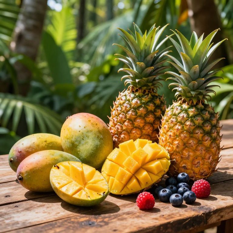Spoiled tropical fruit feast on a rustic wooden table, ripe mangoes, pineapples, and exotic berries spilling over, bright sunlight highlighting the juicy textures, lush jungle background with vibrant green foliage, a sense of abundance and indulgence.