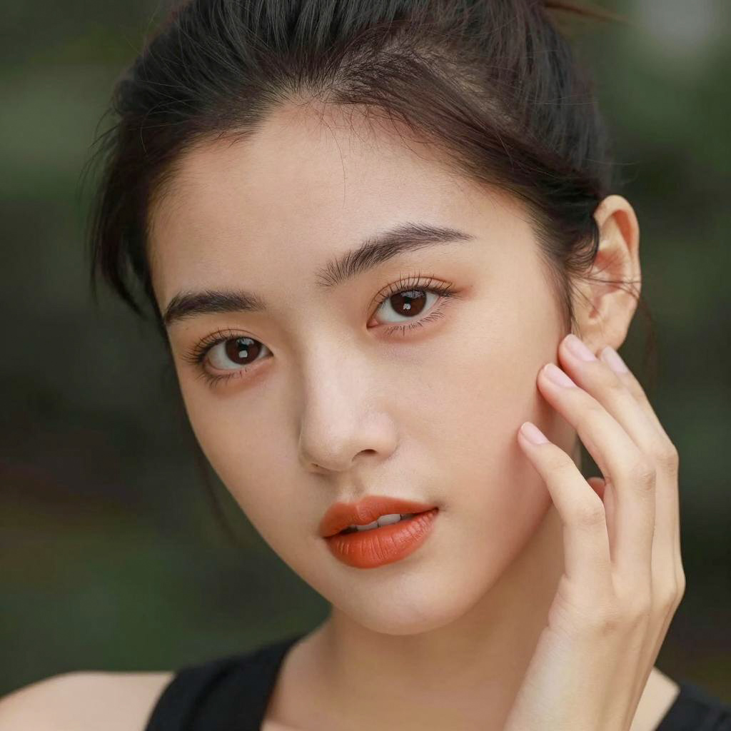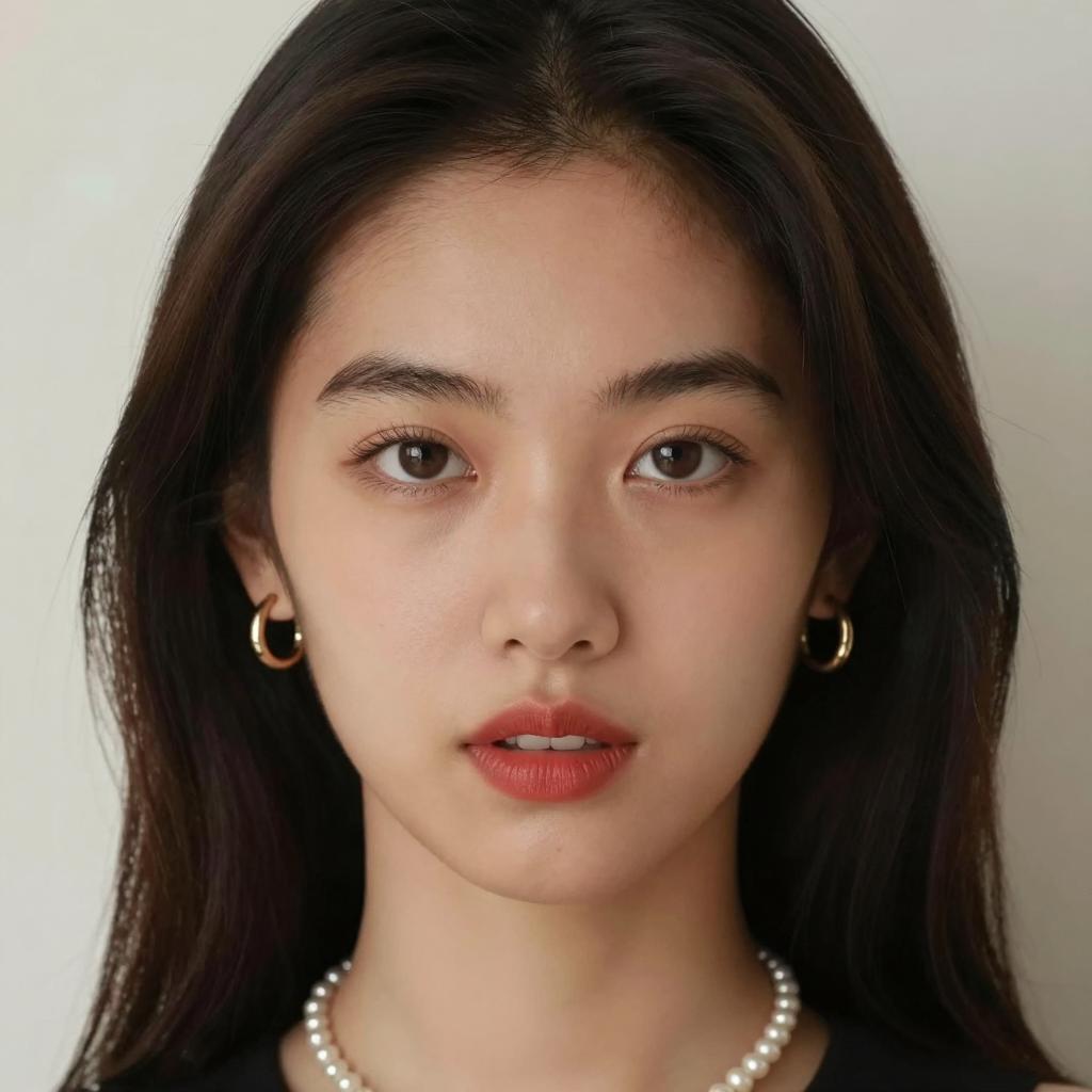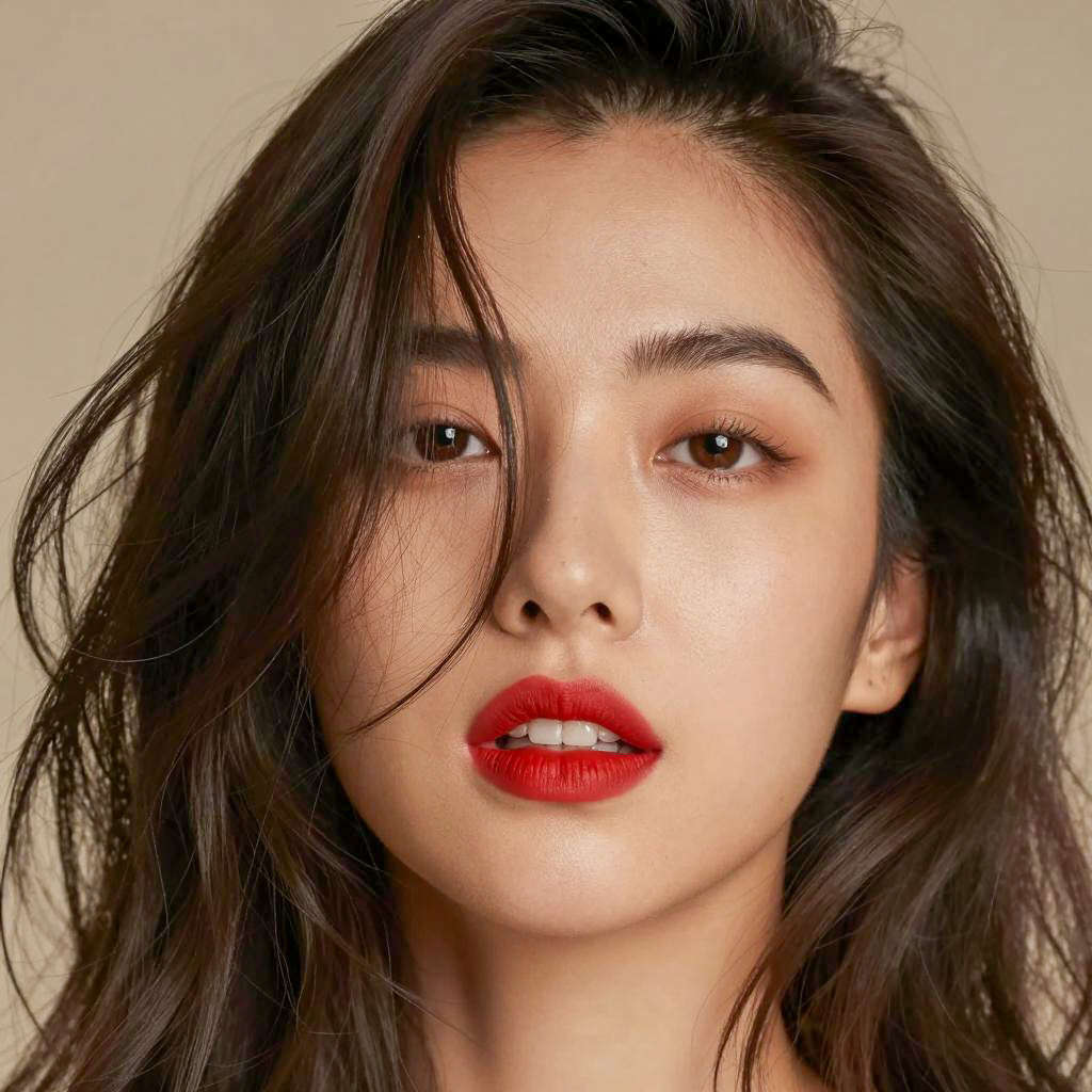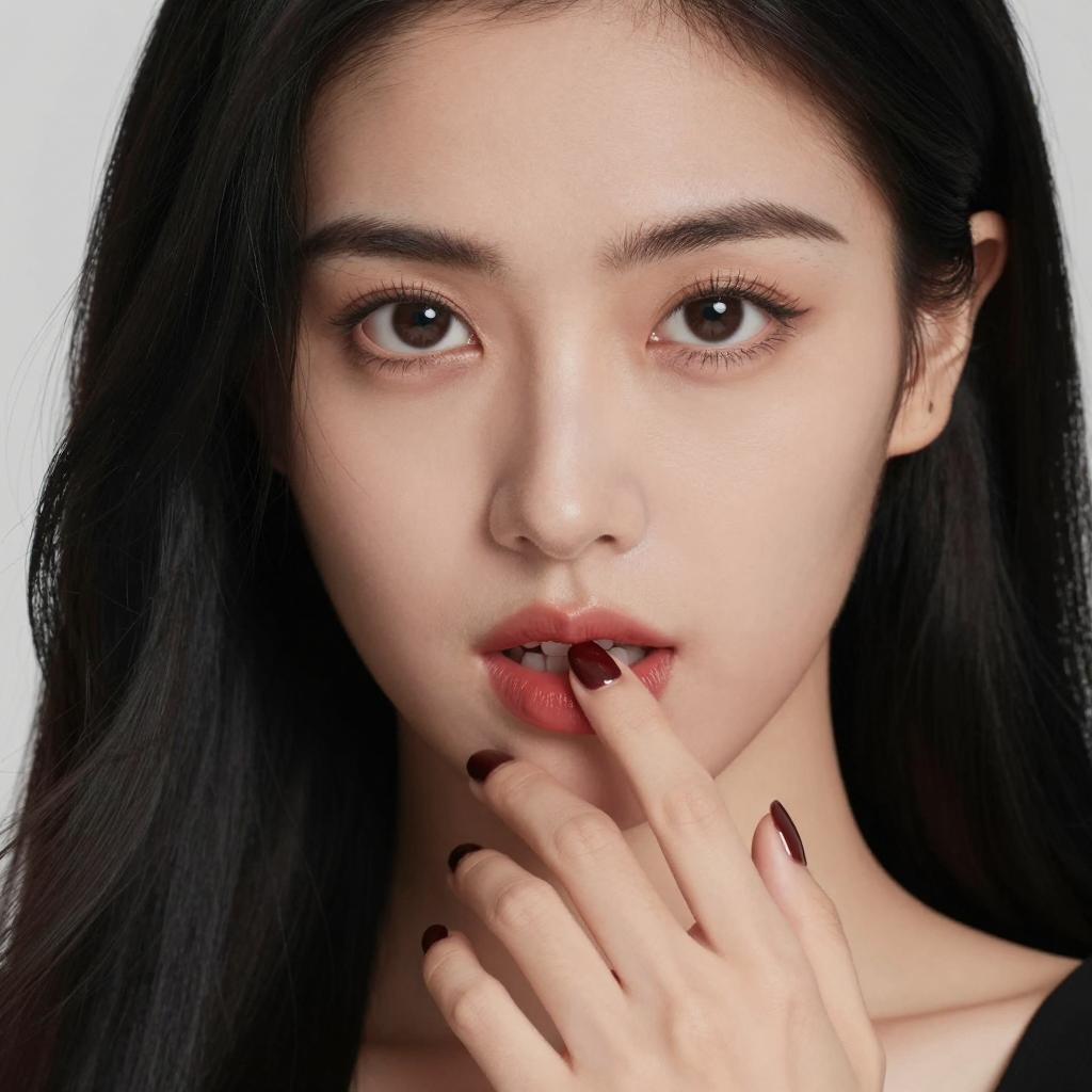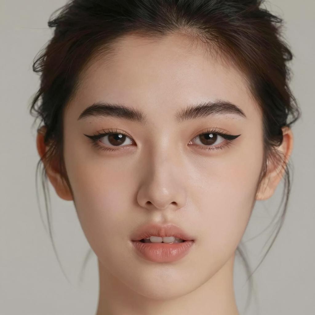 Close-up photograph of a woman with dark, thick eyebrows, heavy black eyeliner, and full lips. She has dark brown hair in a messy updo. Her eyes are slightly squinted and she has a thin string between her teeth. Neutral background.