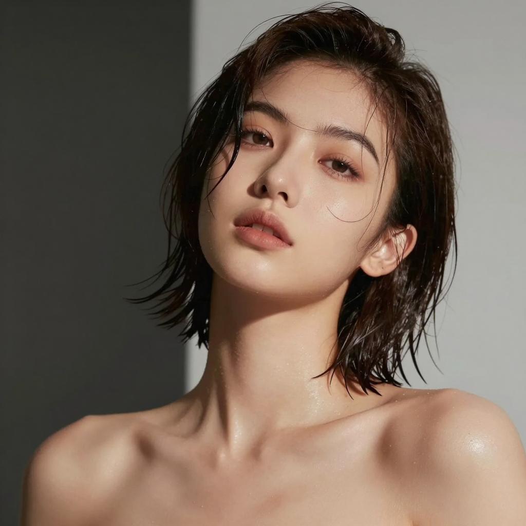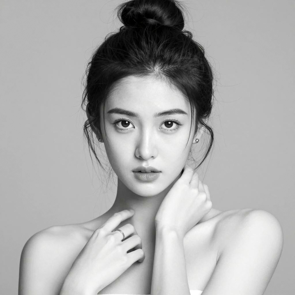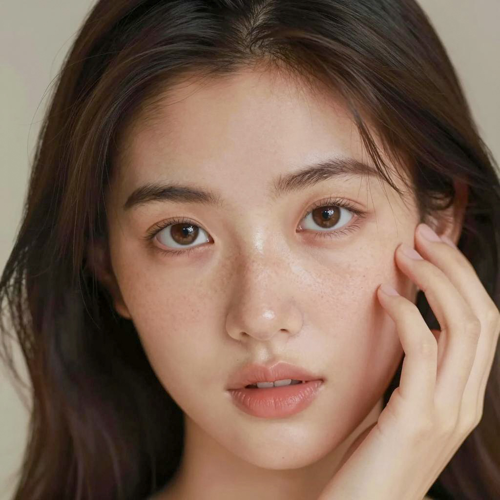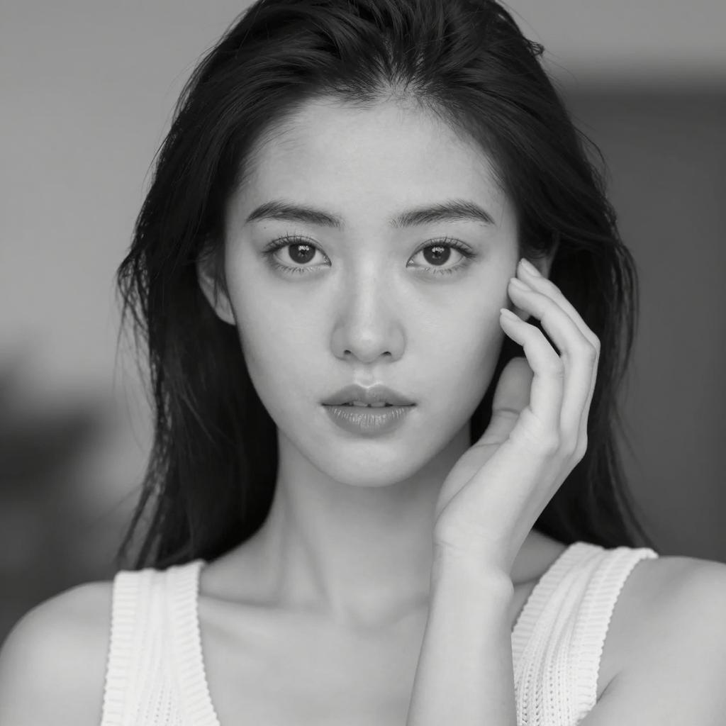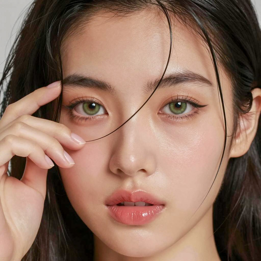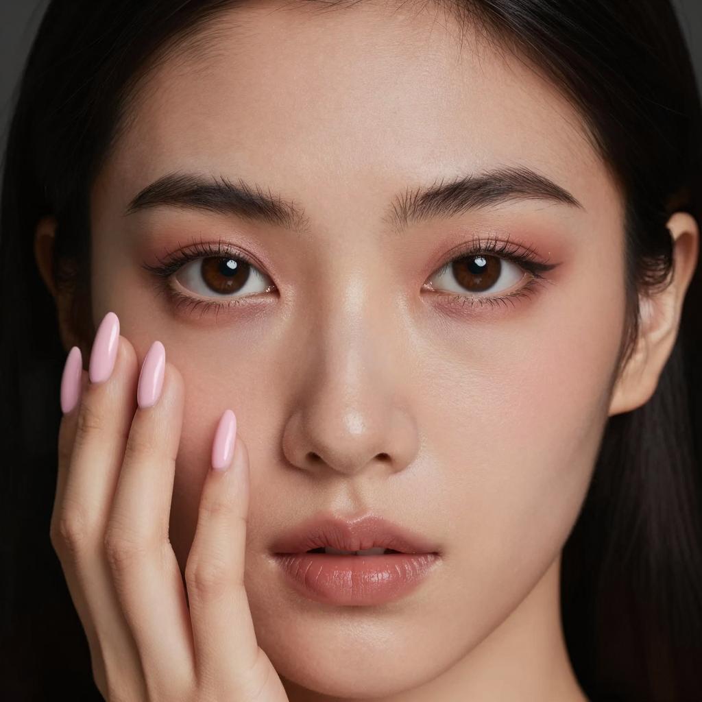 Close-up photograph of a woman with dark, thick eyebrows, heavy black eyeliner, and full lips. She has dark brown hair in a messy updo. Her eyes are slightly squinted and she has a thin string between her teeth. Neutral background.