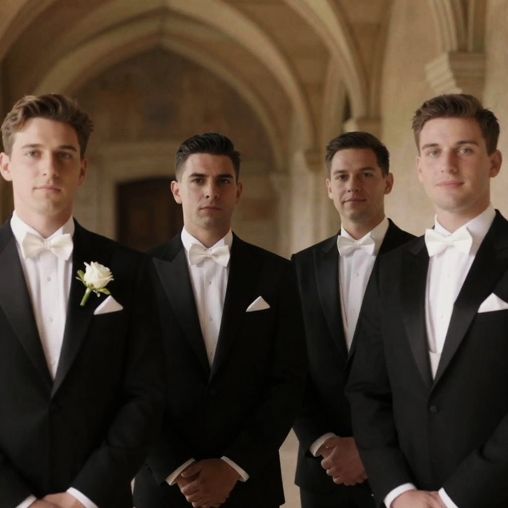 Photograph of four men in formal black tuxedos with white bow ties and dress shirts, standing in a dimly lit, arched stone hallway. The man on the left has a white rose boutonnière, and all wear white pocket squares with initials. The man in the center looks forward with a serious expression. The man on the right also looks forward, slightly smiling. The man on the far right has side-swept hair and is partially visible. Warm, soft lighting highlights the men's faces and the intricate stone arches in the background.