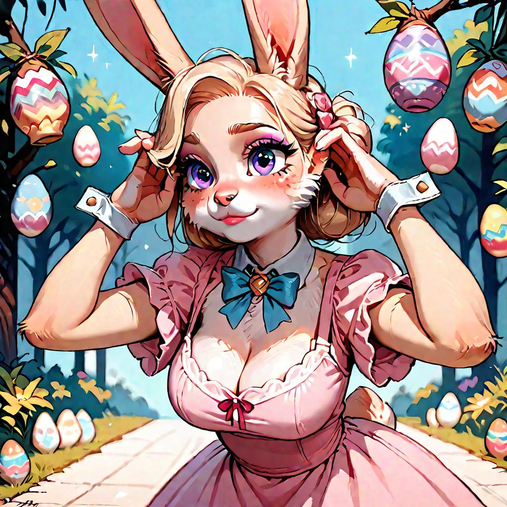 Source_cartoon, rating_questionable, score_9, score_8_up, score_7_up, cute 1girl easter rabbit furry, cleavage, sunny meadow, pink sundress blowing in breeze, easter eggs, shy, cute pose, shallow depth of field, drkpny