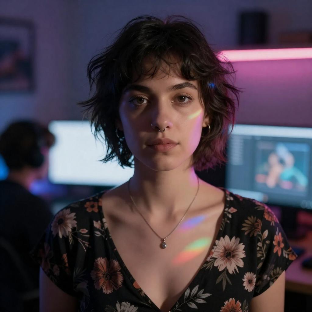 Portrait of a young woman with short dark hair wearing a sleeveless brown top, standing by a window in a dimly lit room. She has a tattoo on her left upper arm and holds the window frame with both hands while looking intently outside. Soft vertical light beams create shadows on the wall behind her.